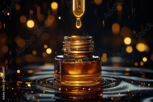Amber liquid in glass bottle luxury product photography