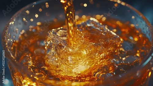 Amber Liquid Pouring into Glass with Ice Cubes: A Close-Up