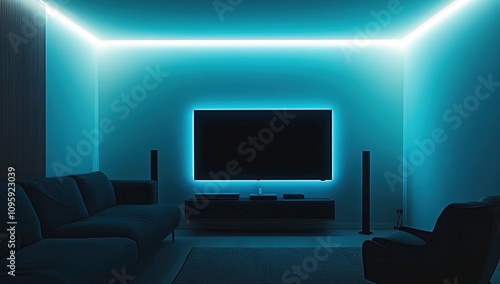 Ambient Teal Home Theater Setup: Modern Living Room with LED Lighting and Entertainment System