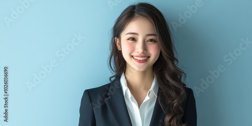 Ambitious and assertive Asian businesswoman in a blue suit, displaying a focused and determined expression. She projects confidence and authority, ready to take on leadership roles.