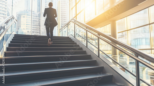 Ambitious businessman ascending stairs in modern office building with bright sunlight