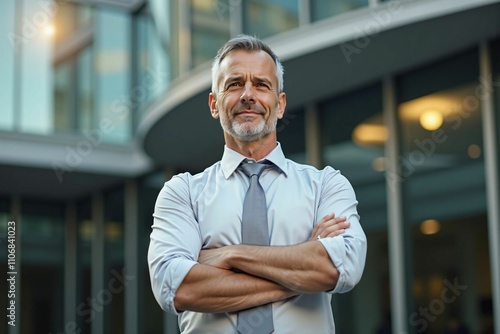 Ambitious Executive with Vision and Confidence in Front of Modern Glass Building