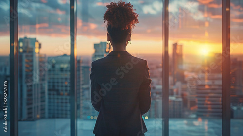 Ambitious professional standing alone in an urban office, reflecting on her career