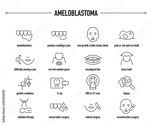 Ameloblastoma symptoms, diagnostic and treatment vector icon set. Line editable medical icons.