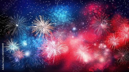 America USA holiday independence day or new year, new year eve fireworks celebration background banner - Firework pyrotechnics in red blue white, night sky, Generative AI
