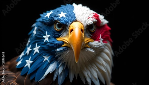 American bald eagle with vibrant feathers, yellow beak, and striking blue eyes painted with the American flag