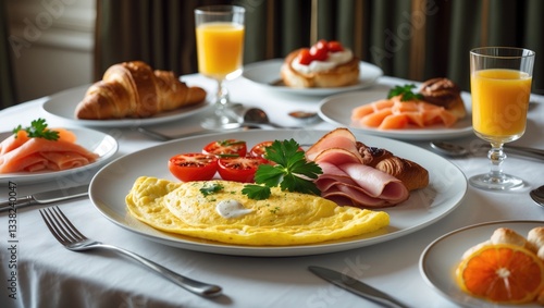 American Breakfast served at a hotel usually features a selection of hot and cold items like eggs, bacon, sausages, toast, pancakes, hash browns, fresh fruit, cereal, and coffee or juice.