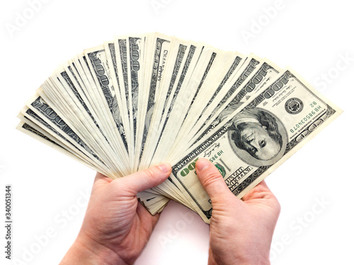 American dollars and hand isolated on white background. Paper money in hand. Business and finance.