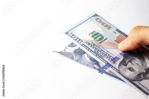 American dollars in a man's hand on a white background first-person view. Burnt dollars. Dollars are burning, Ashes, fire