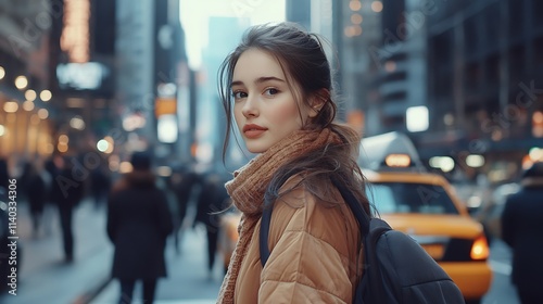 American female model in casual wear, standing confidently on a busy New York street