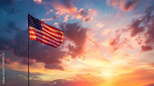 American flag fluttering against a dramatic sunset sky. The flag stands tall on the left side of the frame. copy space for text.