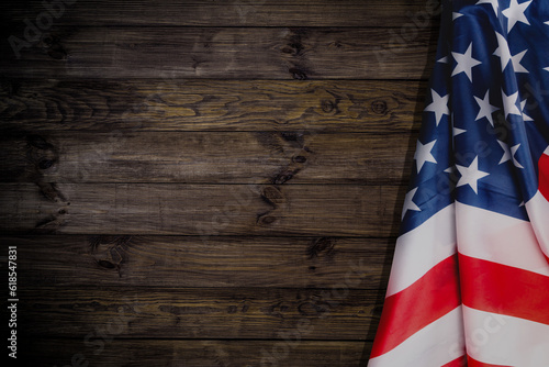 American flag on brown wooden background. USA star-spangled banner. Memorial Day. 4th of July. Independence day. Veterans day. Waving flag design for poster, flyer, greeting card, invitation.