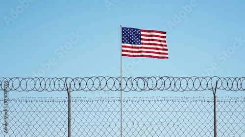 American Flag Waving Above Barbed Wire Fence Against Clear Sky: Symbol of Freedom and Security