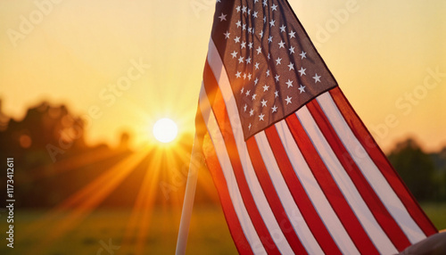 American flag waving at sunset in a vibrant landscape