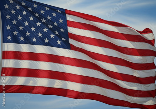 American flag waving in the wind against a blue sky background