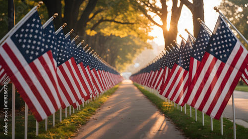 American flags line sidewalk at sunset, a patriotic tribute to freedom