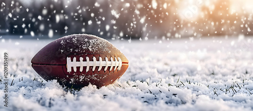American football ball on the snow on a snowy day during the Christmas and New Year holidays