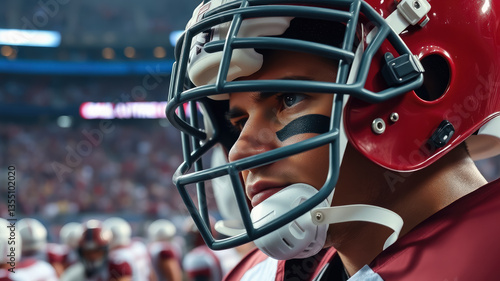 american football player in helmet, male athlete on football field, match, competition, championship, equipment, protection, close-up portrait