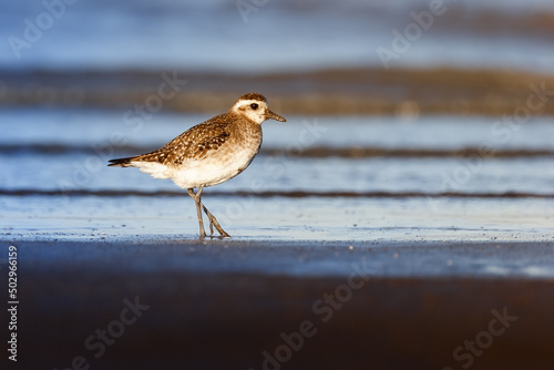 American Golden Plover on the ocean shore with mourning light