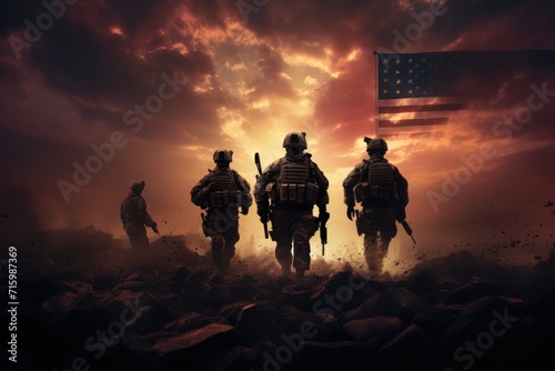 American soldiers against the backdrop of sunset and the usa flag. war and independence day. victory and patriotism