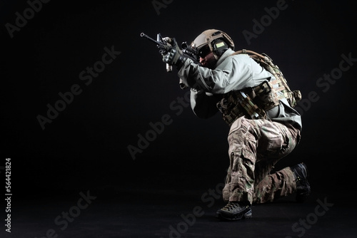 American special forces, a soldier in a military uniform with a weapon attacks on a black background, a ranger for special operations