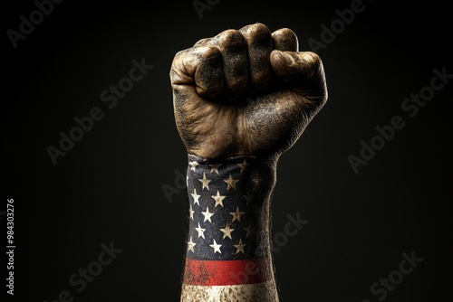 American Strength: A powerful fist raised high, painted with the American flag, symbolizes resilience, determination, and the fight for freedom.