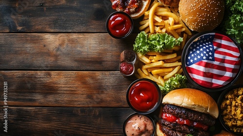American traditional food with USA flags on wooden background Memorial Day celebration : Generative AI