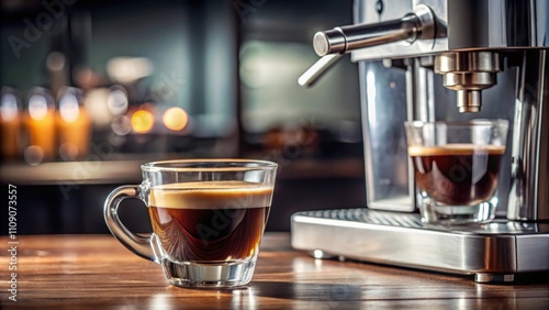 Americano coffee in a glass cup next to an espresso machine, Americano, coffee, glass cup, espresso machine, beverage, drink
