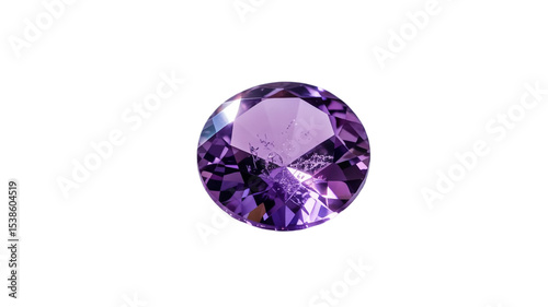Amethyst Gemstone: A single, round-cut amethyst gemstone with its striking purple hue rests in the center, showcasing its flawless clarity and brilliant sparkle.