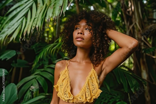 Amidst a lush rainforest A female model in eco-friendly fashion captures a connection with nature Radiating sustainability and style