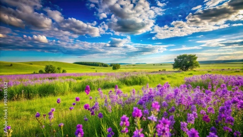Amidst the rolling hills of the American heartland, delicate Violet wildflowers burst forth beside a verdant meadow, dancing beneath a brilliant cerulean sky.