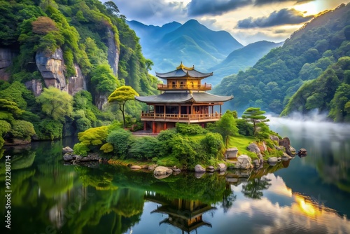 Amidst towering peaks, a serene retreat awaits, where a secluded temple whispers secrets to tranquil waters, lush vegetation, and sacred silence.