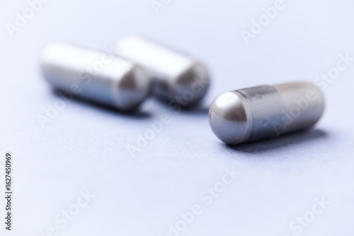Amino acids capsules on bright background. Soft focus. Close up. Copy space.