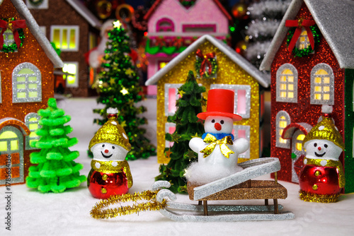 Among the houses of the Christmas town there are two snowmen and one snowman in a red hat between them