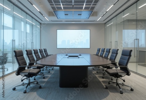 Amplia sala de conferencias con paredes de vidrio, una elegante mesa ovalada y una pantalla inteligente de alta resolución para presentaciones de video