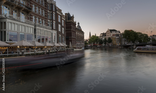 Amsterdam canal at dusk. A wide canal, with a moving canal boat sailing past the houses