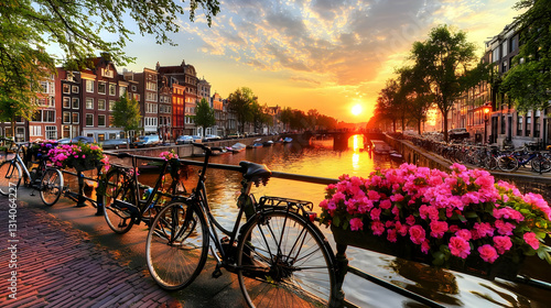 Amsterdam Canal At Sunset With Bicycles And Pink Petunias In Pixel Art