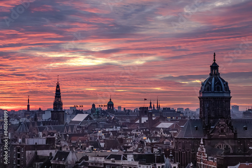 Amsterdam city skyline buildings during a dramatic pink sunset. Photo taken in the evening at Amsterdam Holland