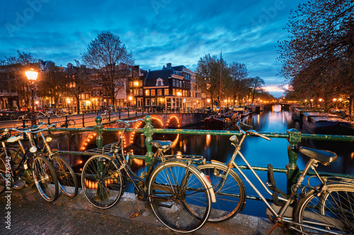 Amterdam canal, bridge and medieval houses in the evening