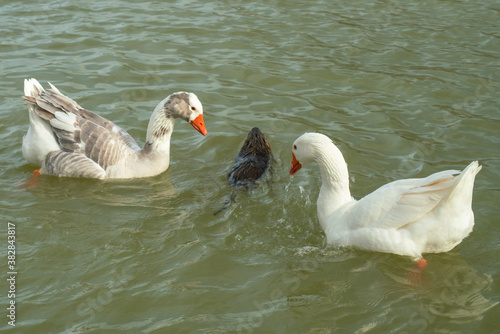 Amusing scene, at the lake, a nutria passes between two white geese who look surprised