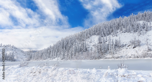Amut Lake - Alpine landslide lake located in the Solnechny District of the Khabarovsk Kray, Russia . Beautiful taiga hills on Far East of Russia in early october. Taiga in winter. Beautiful nature