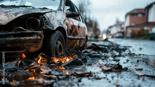 An abandoned car burns on a desolate urban street, surrounded by debris that depicts the devastation of urban life and the impacts of chaos on communities.