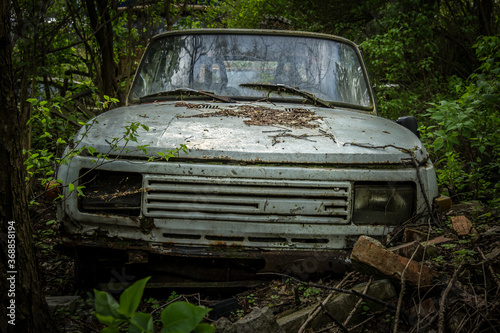 An abandoned car standing in a forest parking lot among other abandoned vehicles