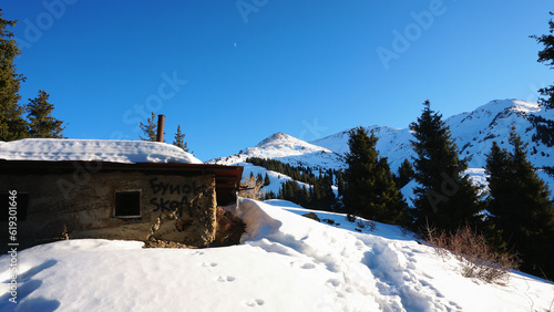 An abandoned house in the snowy mountains. Christmas trees and bushes grow. Clear sky and moon. A small moon in the distance above the top of the peak. There is a lot of snow on the roof. Almaty