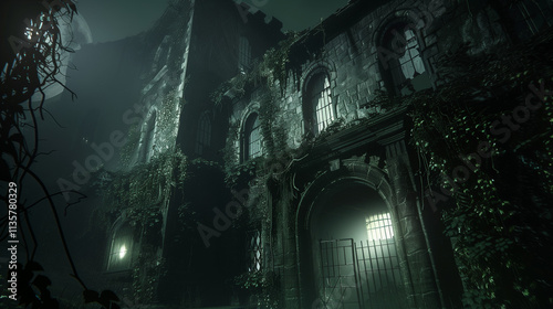 An abandoned mansion shrouded in mist, with broken windows, ivy creeping up its walls, and a faint glow emanating from one room.