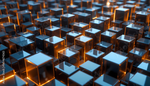 An abstract arrangement of shiny metallic cubes with orange glowing light between the shapes