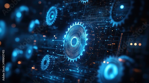 An abstract blue digital technology background incorporating gears and cogs with a dark color palette.
