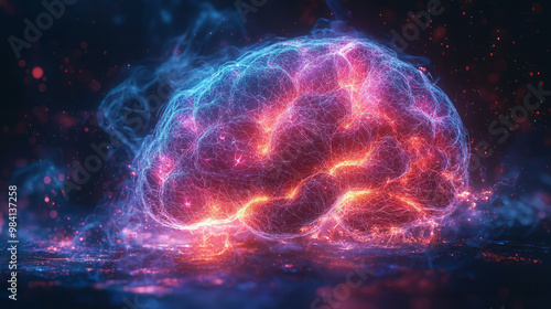 An abstract brain made of colorful wireframe lines in shades of electric blue and pink,