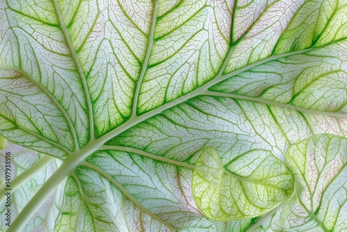 An abstract close-up view of a variegated caladium leaf showing detailed venation, vibrant green and white colors, and intricate patterns of nature's design.