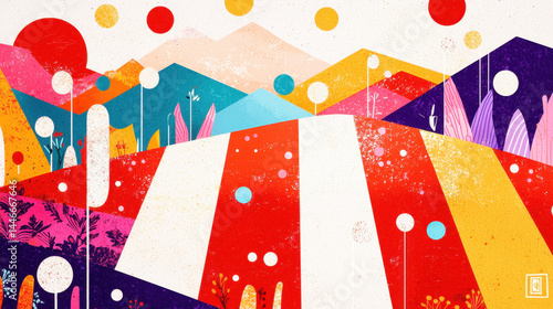 An abstract colorful landscape illustration showcasing natures palette, whical mountains, and vibrant fields, inviting creativity with its open copy space.